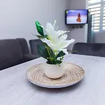 Badeværelset har separat toilet og en bruser, mens værelse har kaffe- og tefaciliteter, et opholdsområde, tv.